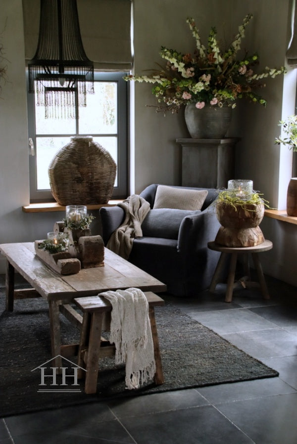 Het stoere en handgeweven carpet in een heel donker gijze kleur/bijna zwart. is gemaakt van Hennep. Dit vloerkleed heeft een afmeting van 170 x 240 cm.