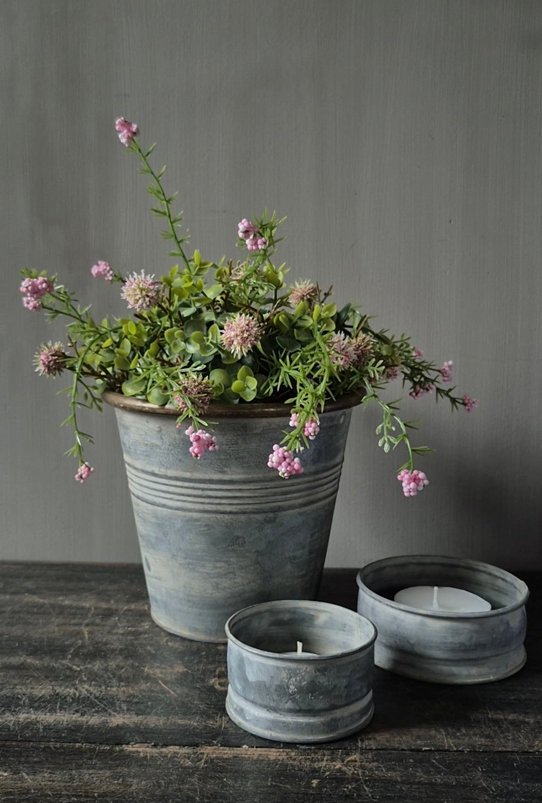Zinken pot - rond - met halve kunstbol en waxinelichthouders